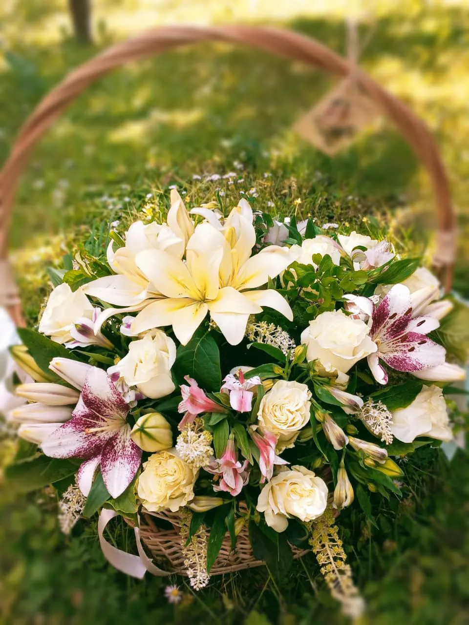• Стандарт - розы - 5 шт, альстромерия - 6 шт, лилии - 3 шт, кустовая роза - 3 шт, оазис, корзина.