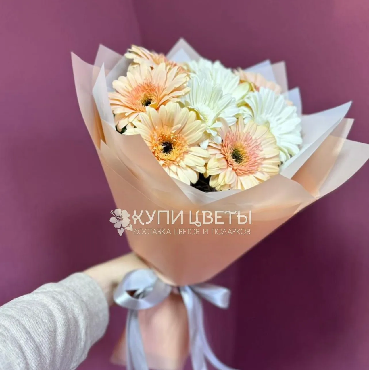 Пышные головки гербер с их аккуратными лепестками выглядят как маленькие солнышки, излучающие тепло и позитив. Букет в таких оттенках универсален: он подойдет как для торжественного мероприятия, так и для того, чтобы просто порадовать близкого человека без особого повода. Он внесет в любое пространство ощущение свежести, гармонии и изысканного стиля.
