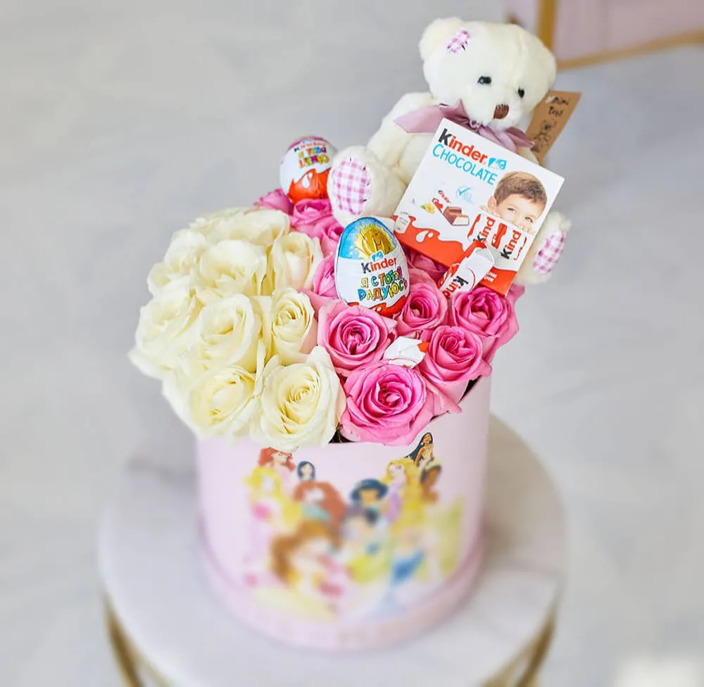 киндер сюрприз - 2 шт., киндер шоколад - 8 шт., мишка - 1 шт., розы ,шляпная коробка