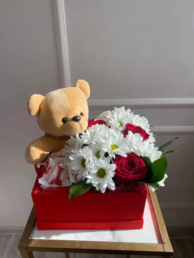 Розы, хризантемы, мишка, раффаэло, коробка, оазис.