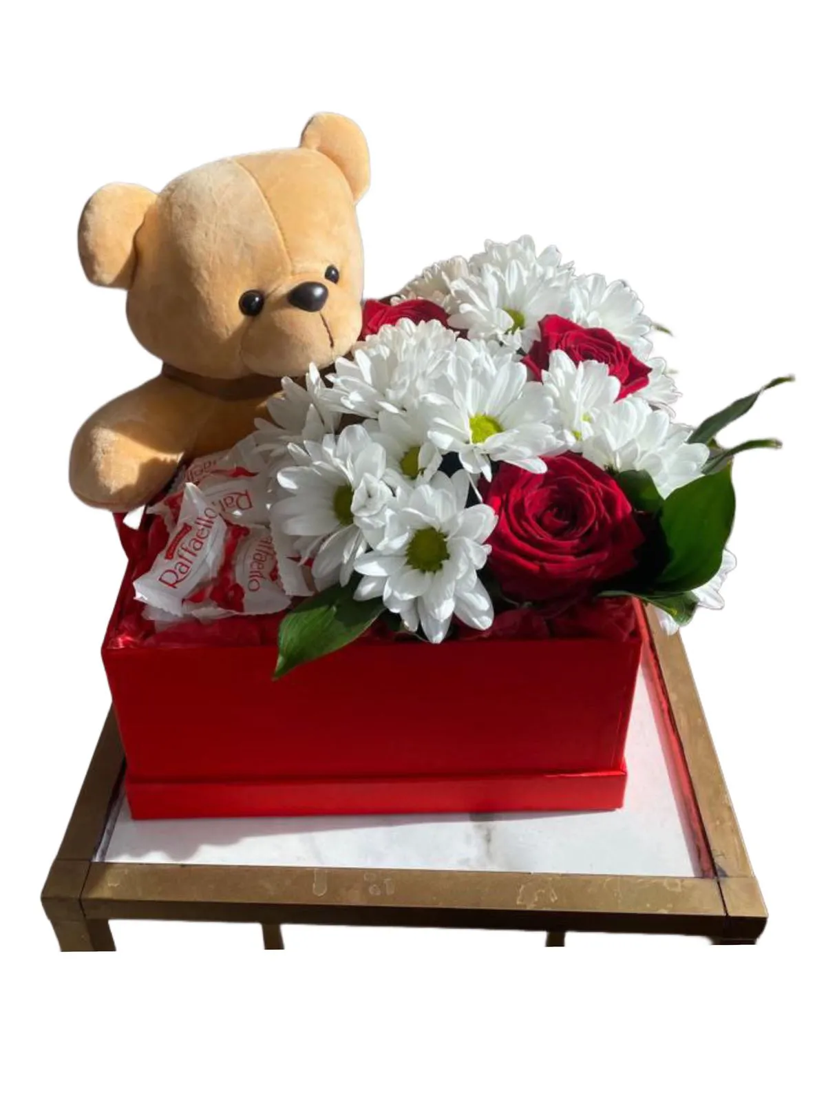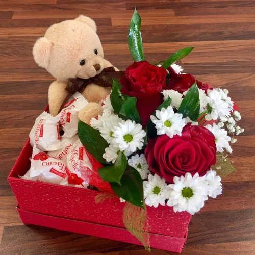 Состав: цветы, мишка, Раффаэло, коробка, оазис.