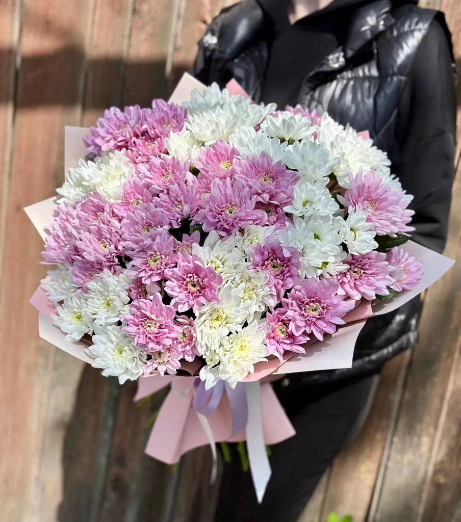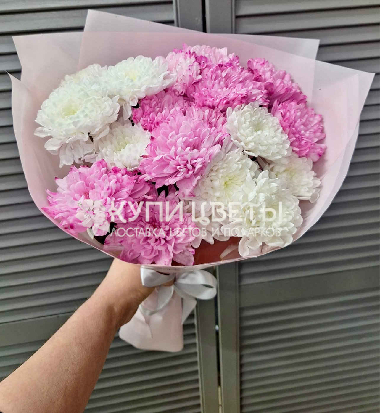Состав букета: Кустовые хризантемы,упаковка,лента