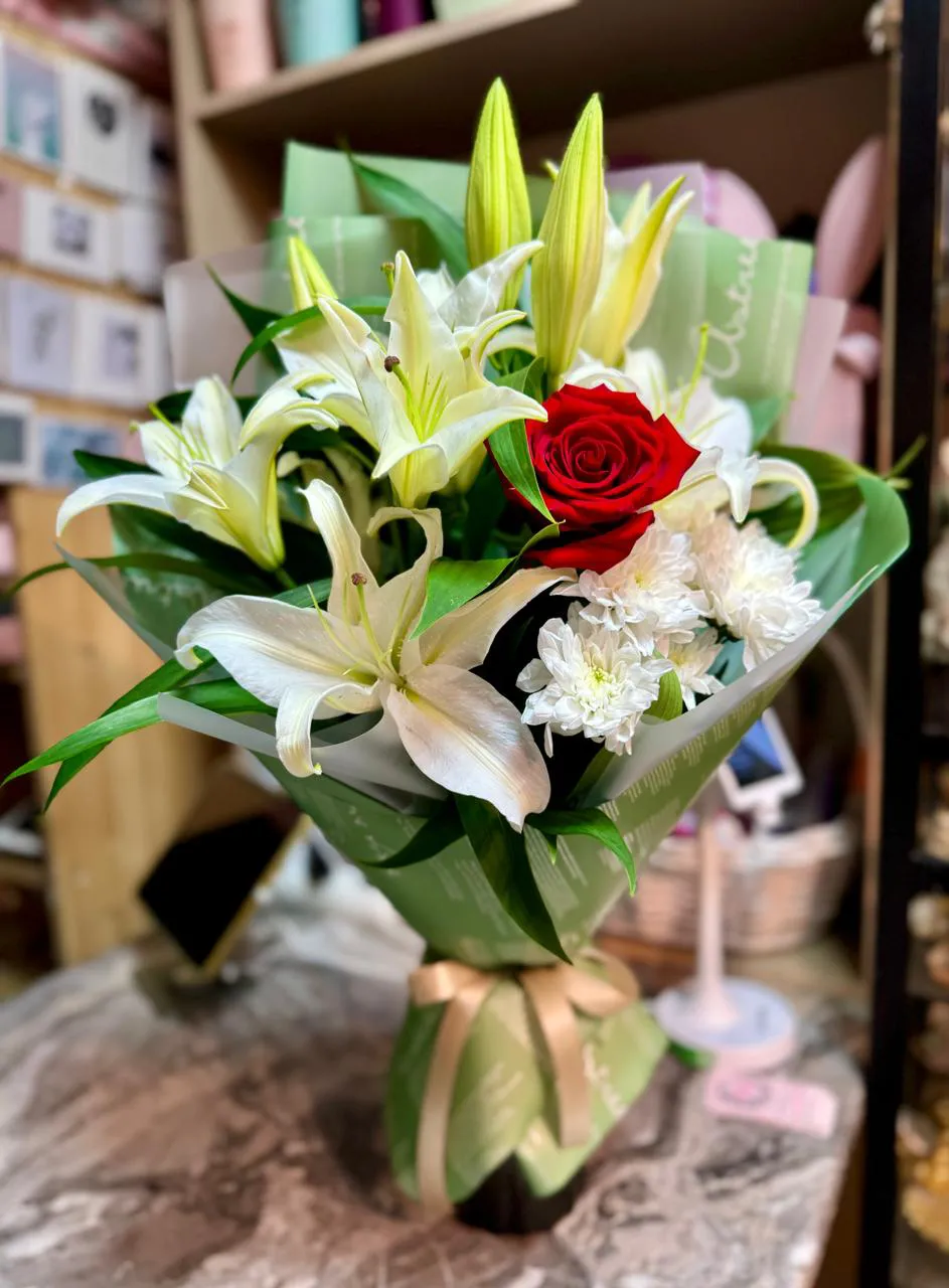 Лилии, роза, кустовая хризантема, упаковка, лента