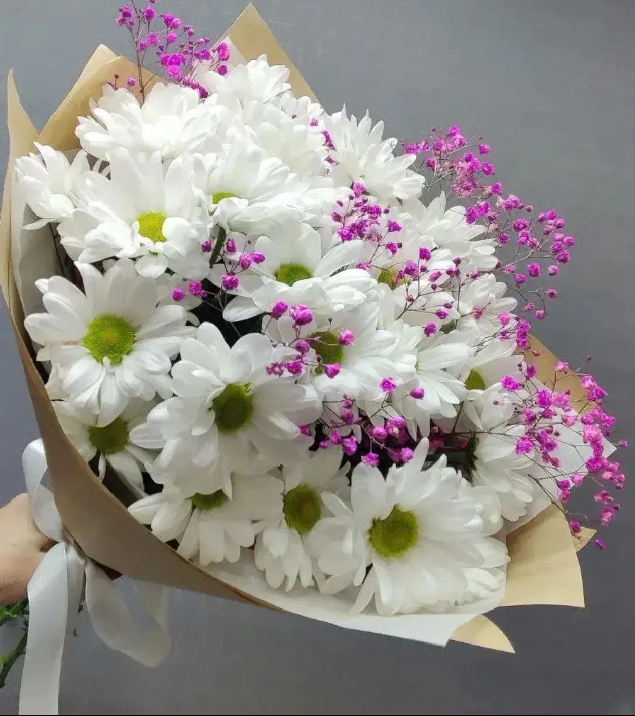 Нежный и воздушный букет с ромашковой хризантемой и розовой гипсофилой — это воплощение легкости, уюта и искренних чувств. Белоснежные хризантемы, напоминающие полевые ромашки, символизируют чистоту и тепло, а облако из розовой гипсофилы добавляет композиции романтичности и мягкого очарования. Он словно создан, чтобы дарить улыбки и наполнять день светом 🌸