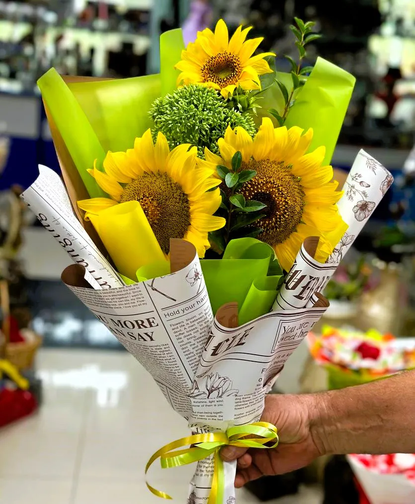 Подсолнухи,зелень,упаковка,лента