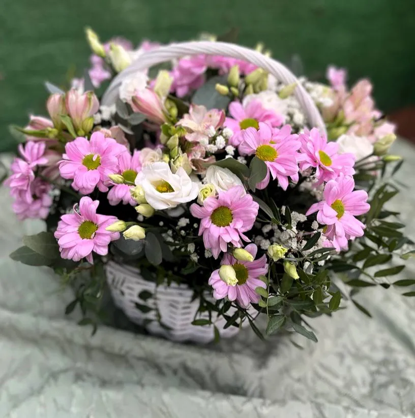 Состав: Кустовая хризантема, эустома, альстромерия, гипсофила, зелень, оазис, корзина