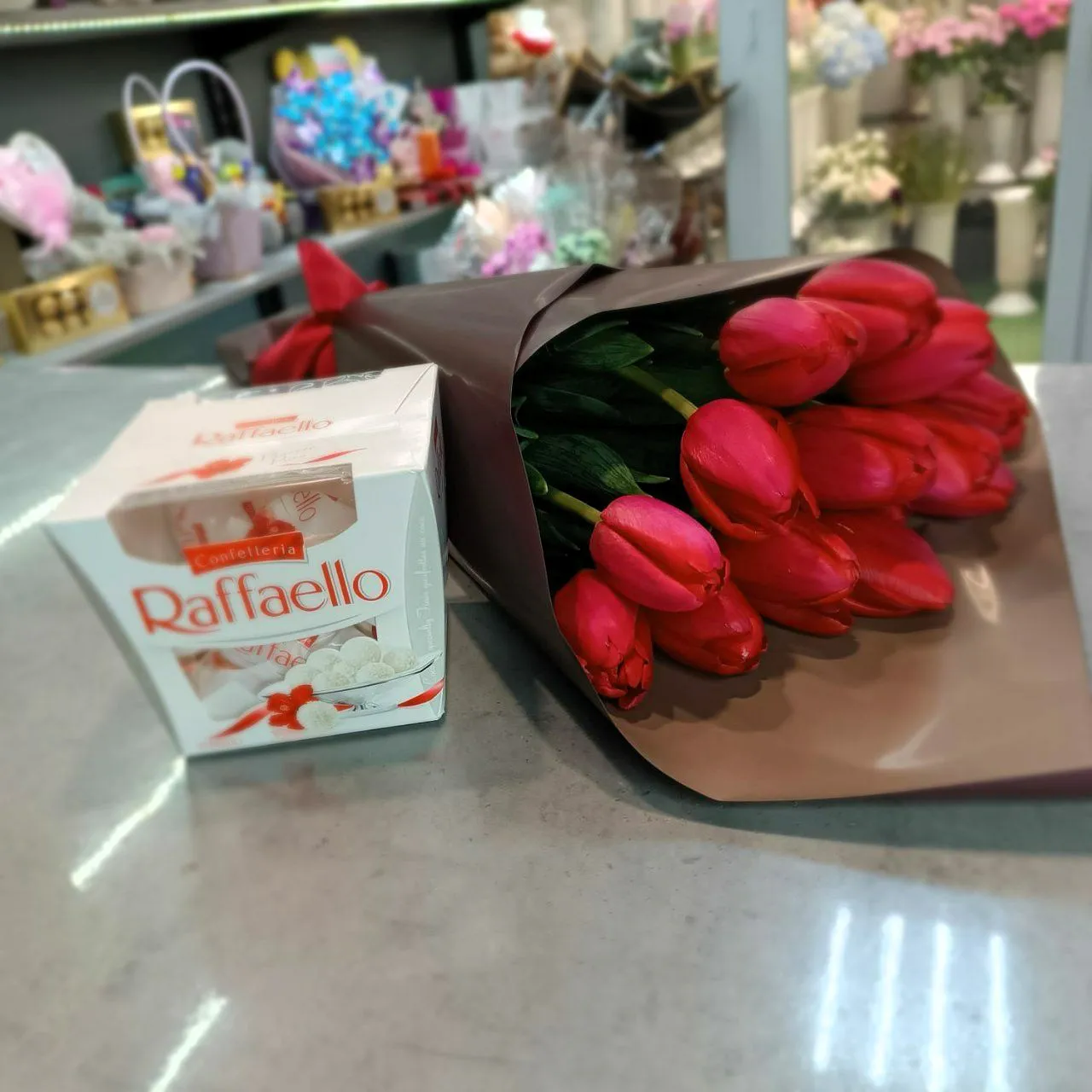 Тюльпаны - 15 шт., упаковка, лента + Raffaello