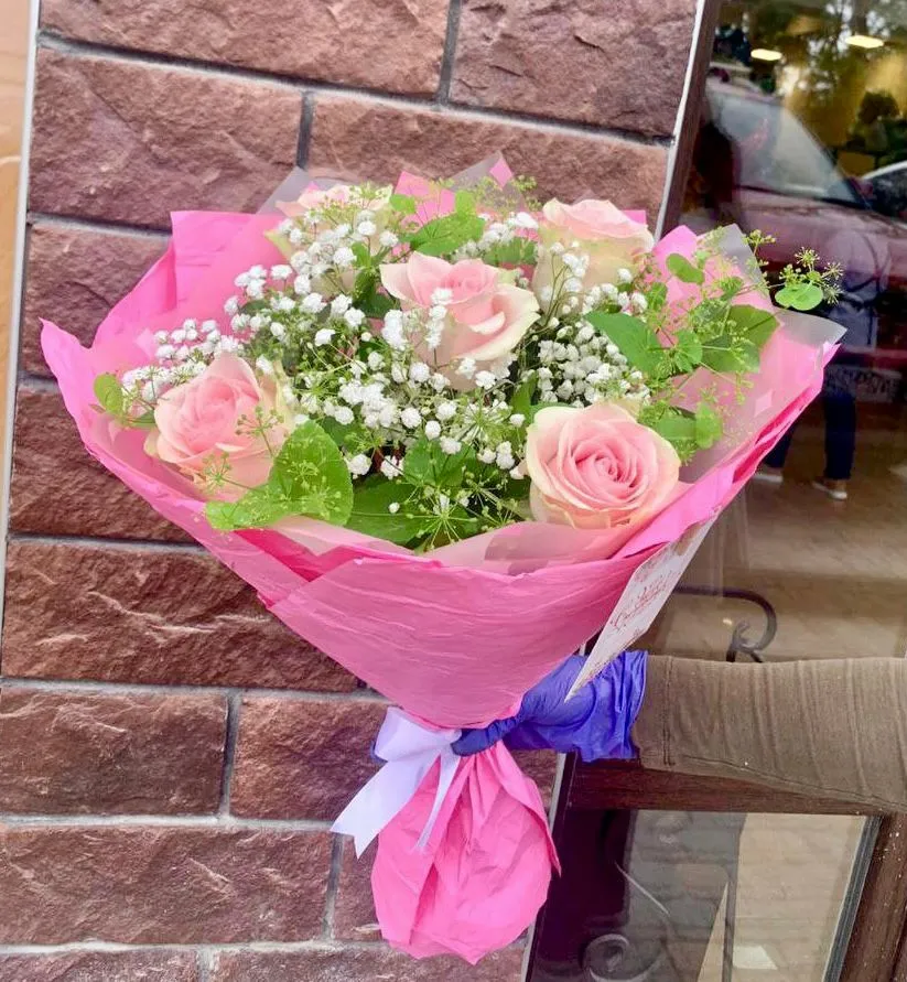 - Мини - роза - 5 шт., гипсофила, упаковка, лента