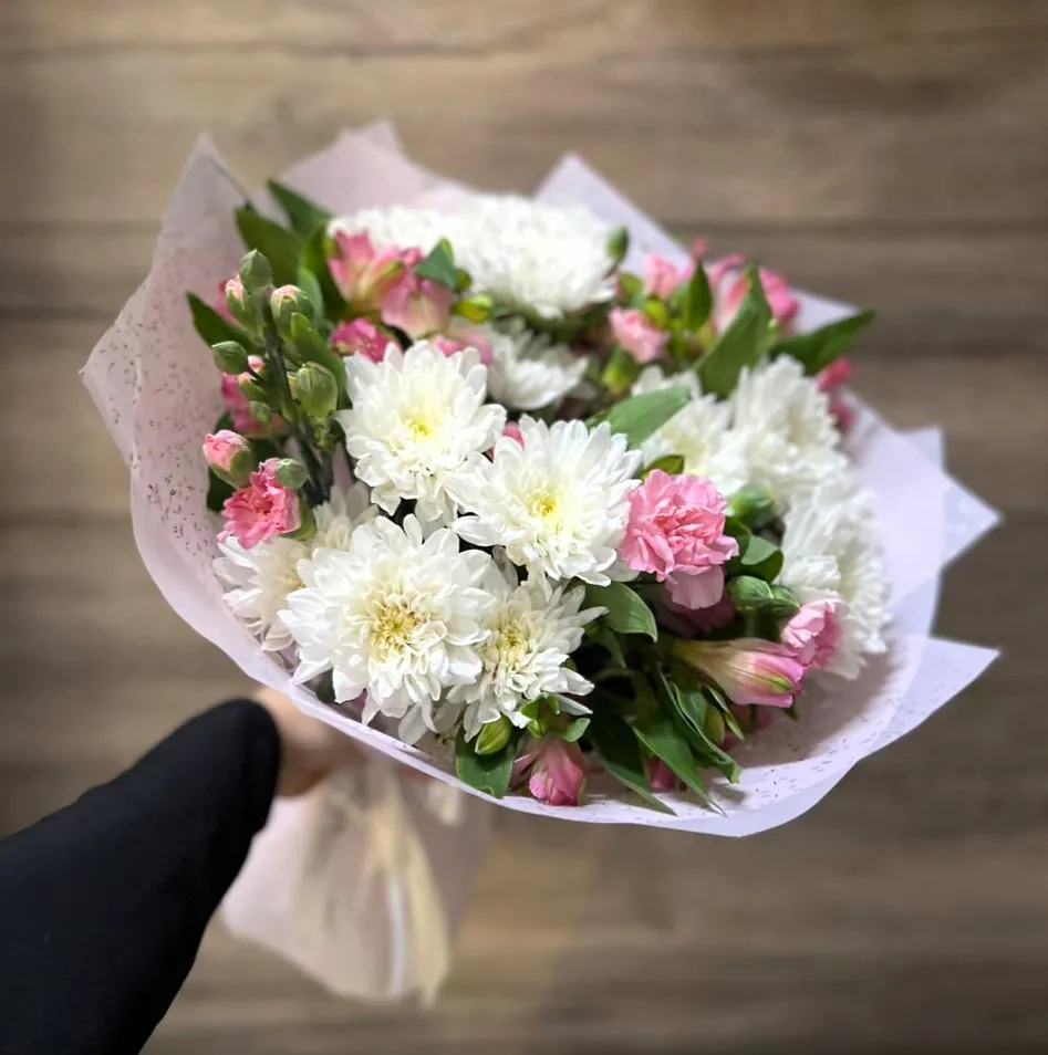 Букет из белых кустовых хризантем и розовых альстромерий представляет собой изысканное сочетание нежности и утонченности. Белые хризантемы, словно утренний туман, излучают свежесть и чистоту, их округлые лепестки создают ощущение уюта и гармонии. Розовые альстромерии, с их яркими, пестрыми узорами, добавляют в композицию игривую нотку и жизнерадостность, напоминающую о теплых солнечных днях.