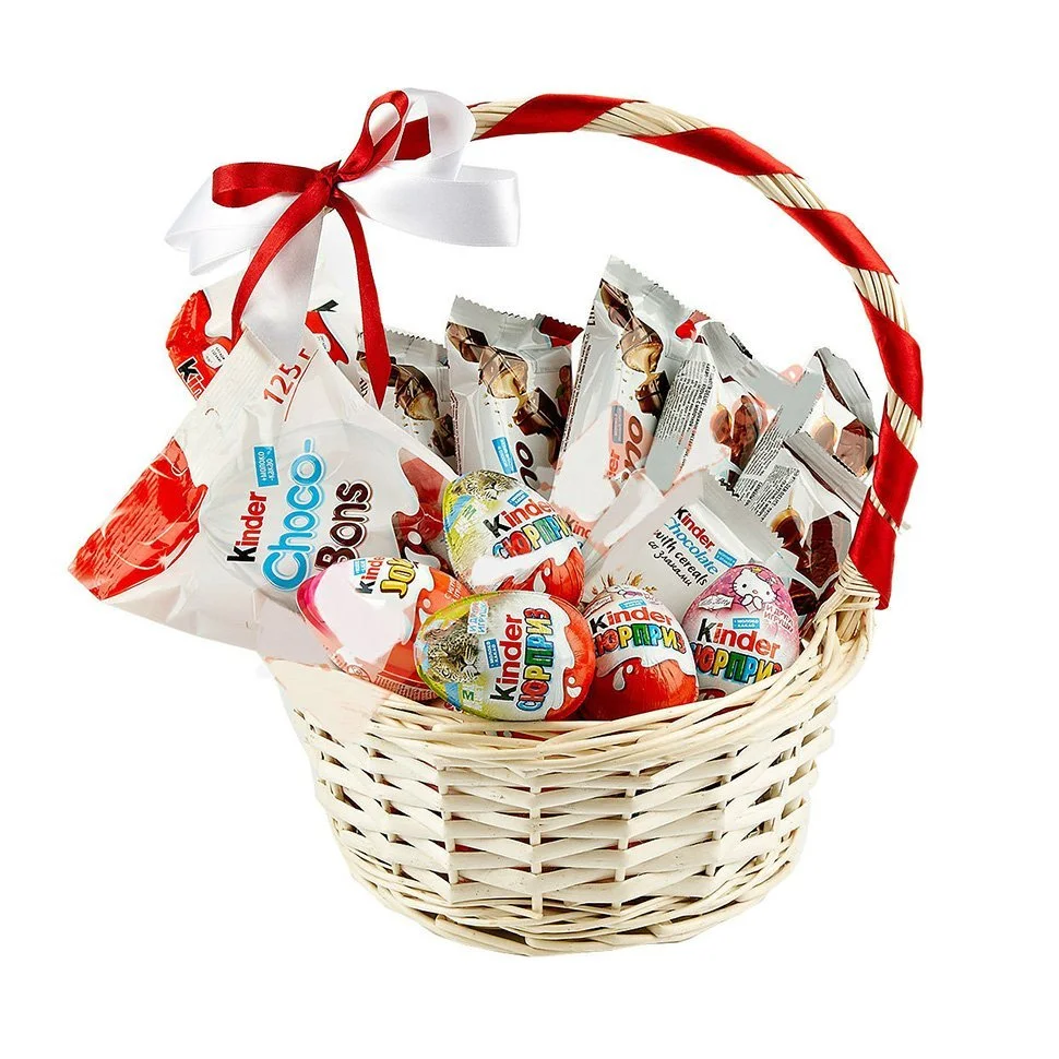 Состав: Kinder Сюрприз - 5 шт., Kinder шоколад (100 гр.), Kinder Bueno - 3 шт., Kinder Country - 3 шт., конфеты Kinder 125 гр., корзина