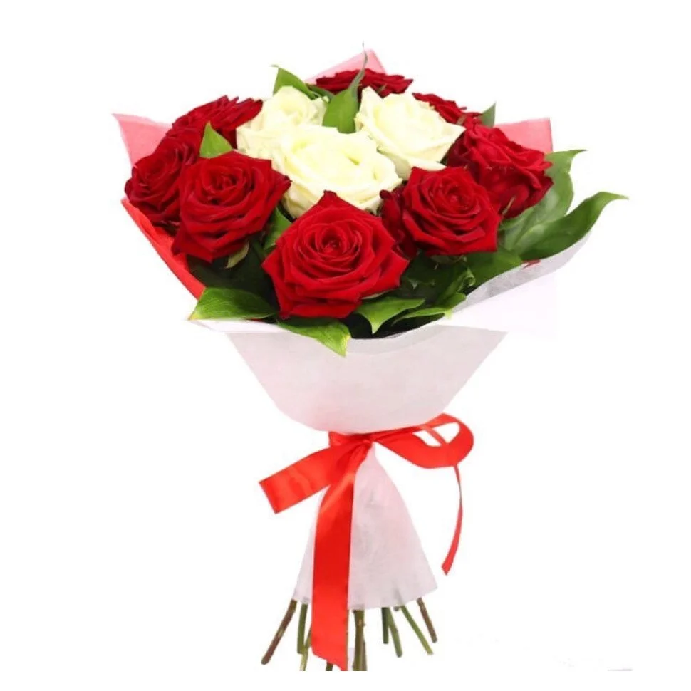 - Средний - роза - 11 шт, зелень, упаковка, лента