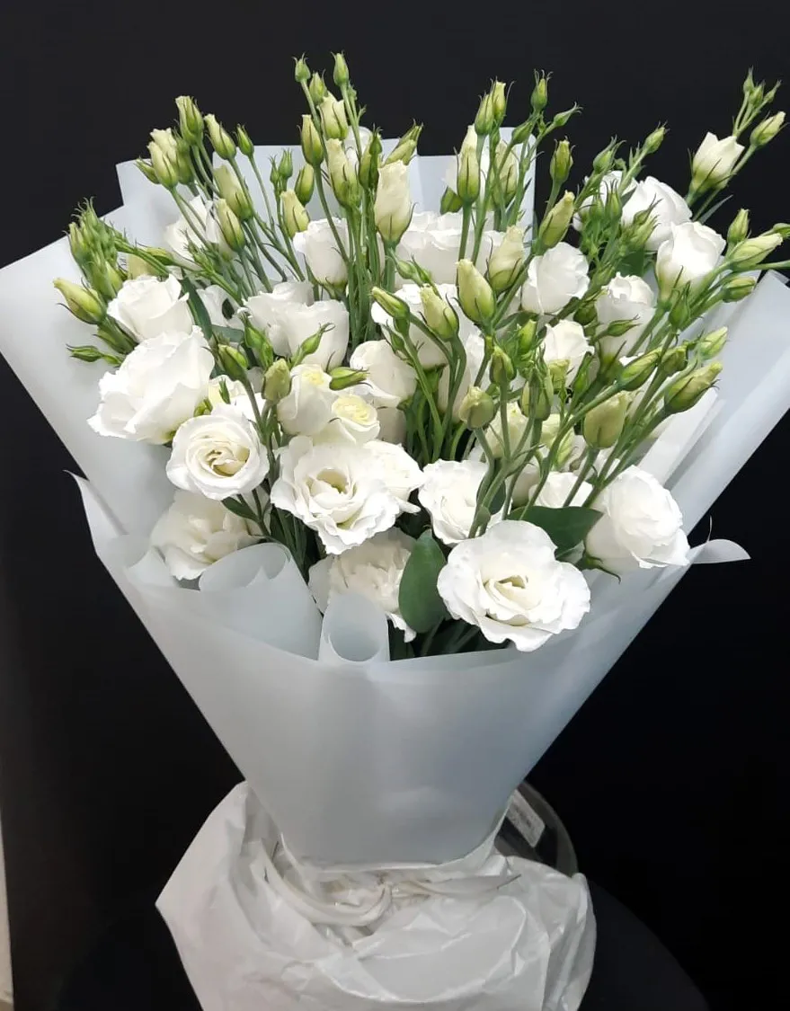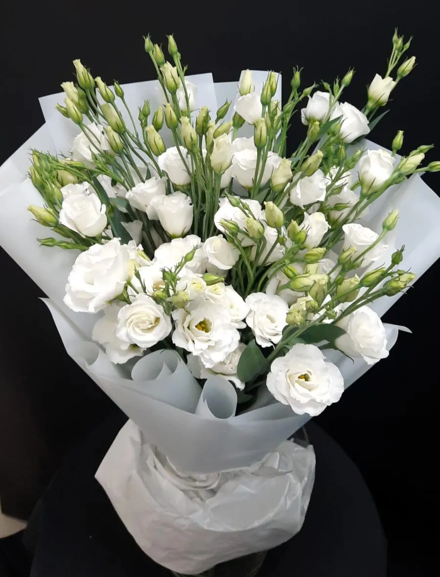 Букет из белых эустом — это великолепное произведение природы, которое сочетает в себе элегантность и утонченность. Нежные, белые цветы излучают ауру чистоты и спокойствия, словно свежий утренний туман. Каждая эустома, с её многослойными лепестками, напоминает о роскоши и грации, создавая ощущение легкости и воздушности.